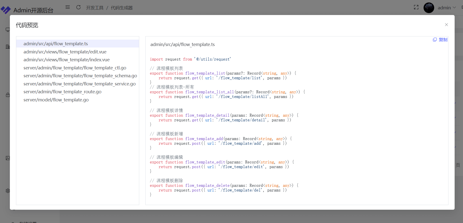 - 代码生成器:一键生成前端、后端、app代码