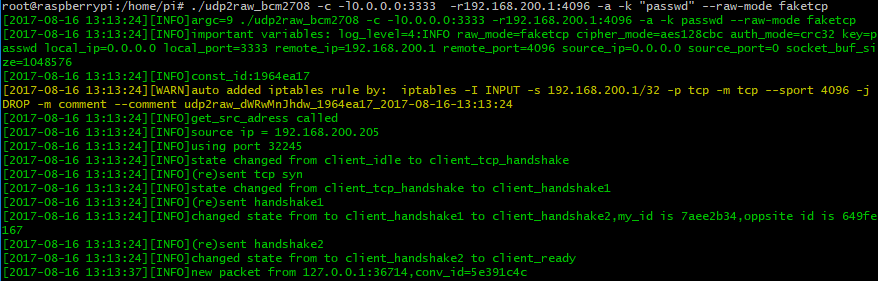 (The above commands need to be run as root. For better security, with some extra steps, you can run udp2raw as non-root. Check this link for more info )