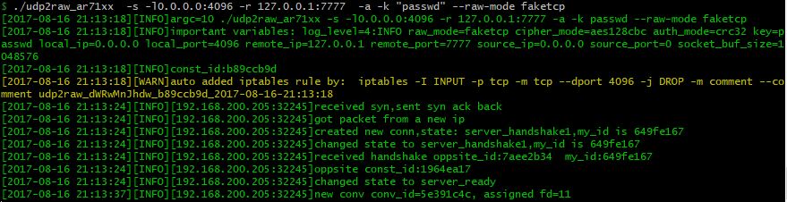./udp2raw_amd64 -s -l0.0.0.0:4096 -r 127.0.0.1:7777    -k "passwd" --raw-mode faketcp -a