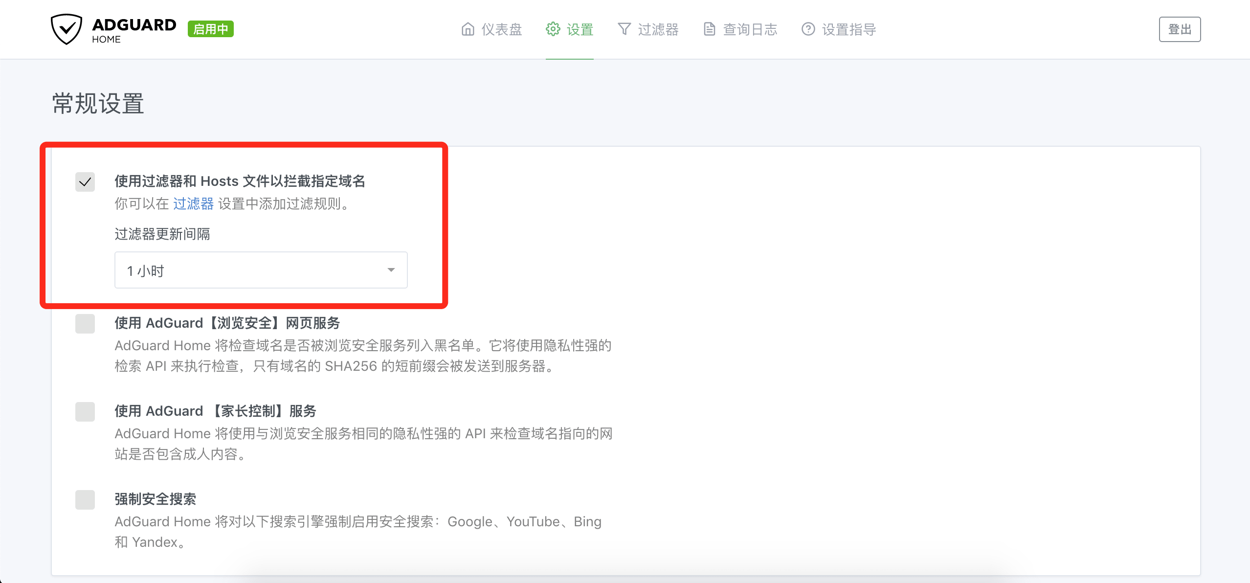 更新间隔在 设置 > 常规设置 > 过滤器更新间隔(设置一小时一次即可),记得勾选上 使用过滤器和 Hosts 文件以拦截指定域名