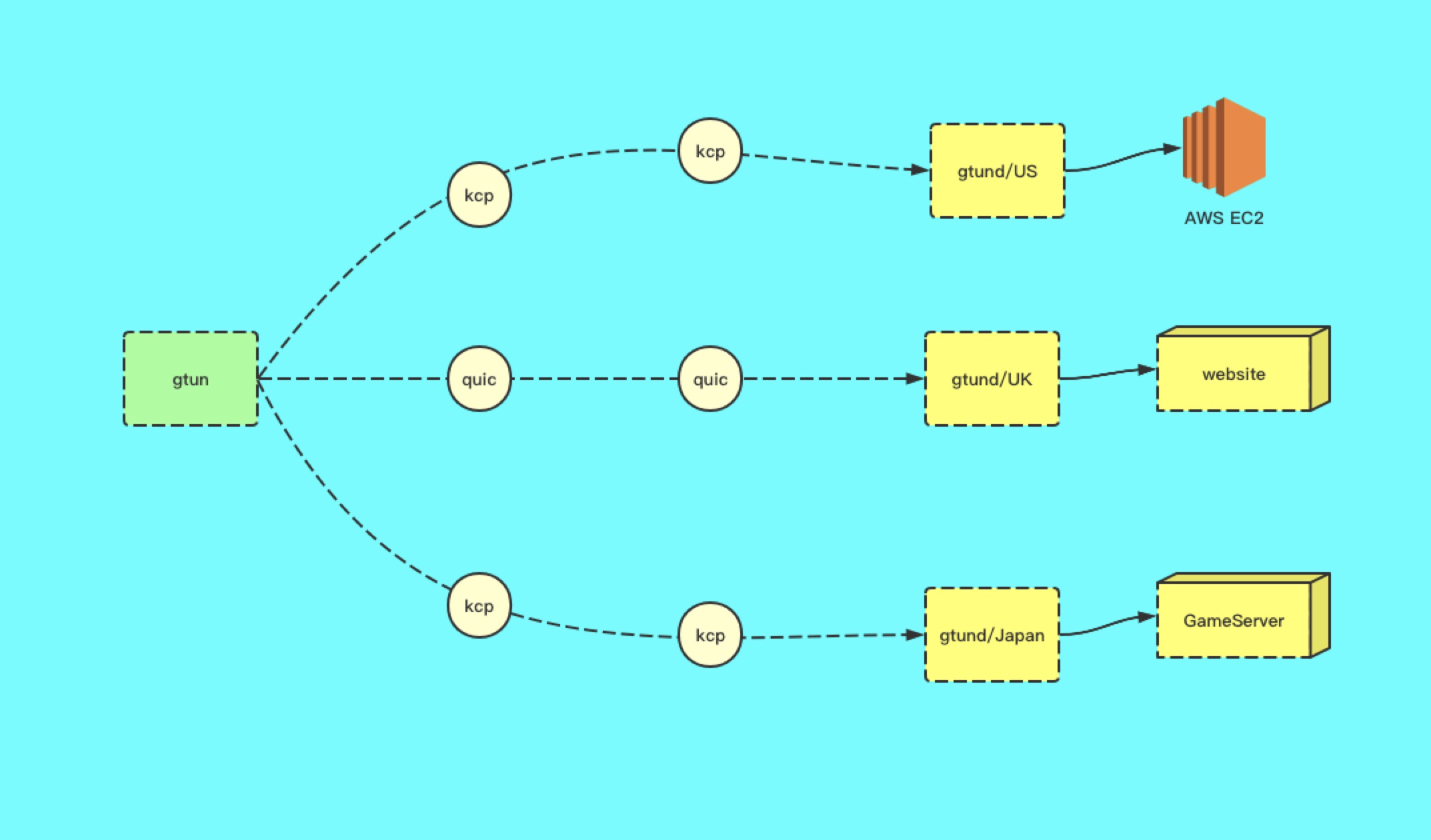 gtun是一款开源的ip代理加速软件目前只支持linux通过tproxy技术实现流量劫持,quickcp等协议优化广域网传输gtun提供一个基础通道所有加入ipset的ip的流量都会被gtun进行拦截并代理到指定出口。 gtun支持多线路配置可以同时对美国日本欧洲目的网络进行加速访问。您可以结合dnsmasq来使用将需要配置加速的域名解析结果加入ipset从而实现域名加速。